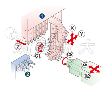 | 三、斯大走心機SR-32J橫向鉆孔5軸單元下方2軸,采用模塊化設計,可根據工件需要自由安轉可交換式工具,實現工藝的靈活性,通過功能模塊的組合,輕松實現各種變化,以此獲得機床的最佳結構。 | |||